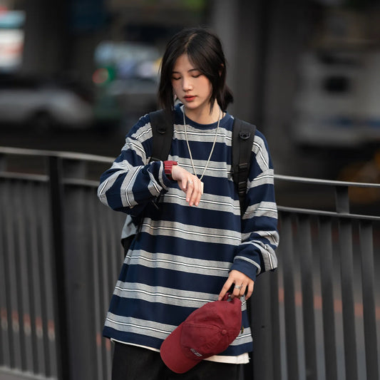 [Oneblue Shop]ストライプ スウェットシャツ ルーズフィット 男女兼用 春秋 ls 091701