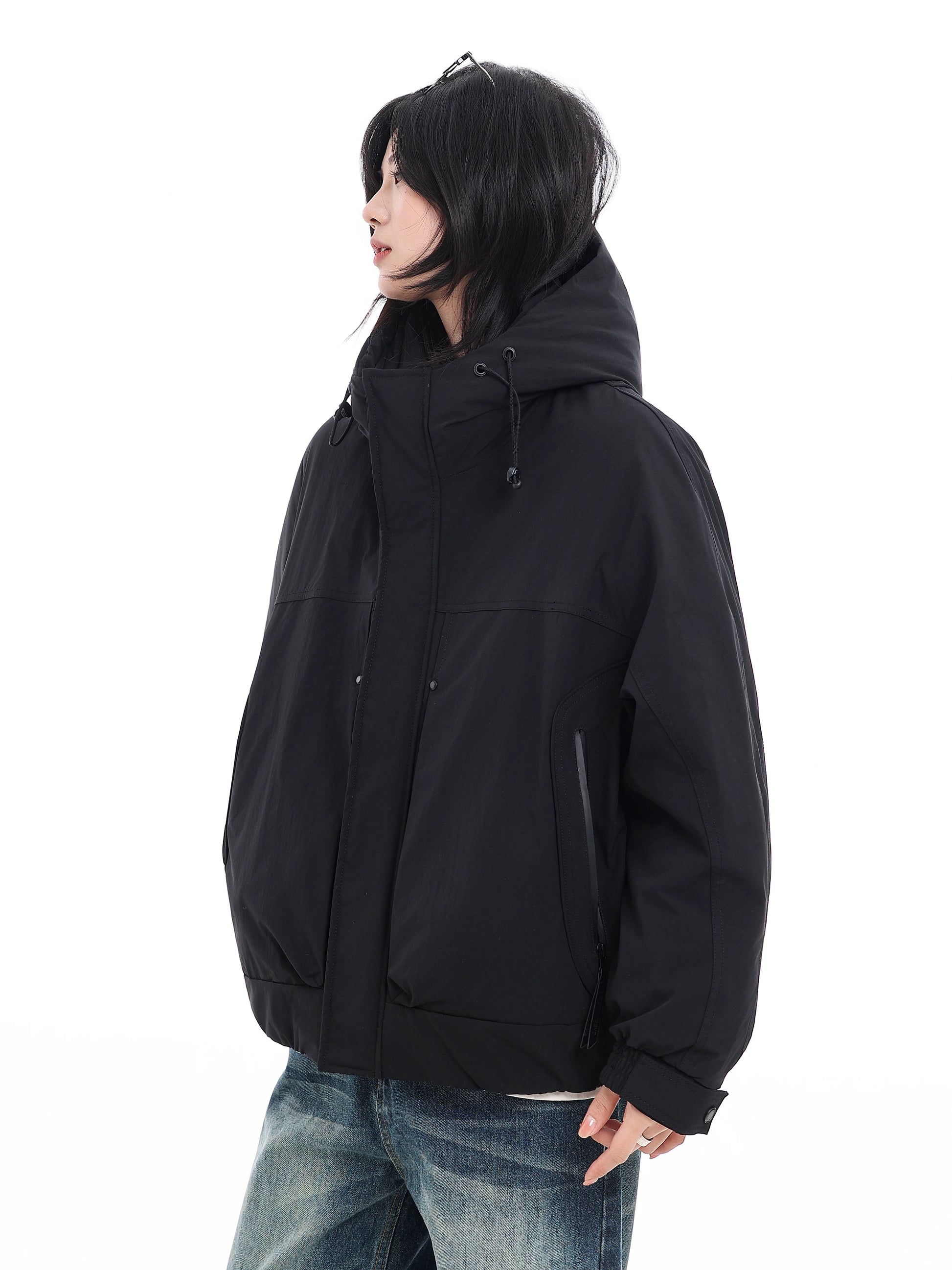 立体的なフードとドローコードによって、シルエット調整から防寒まで細かなコントロールが可能です。